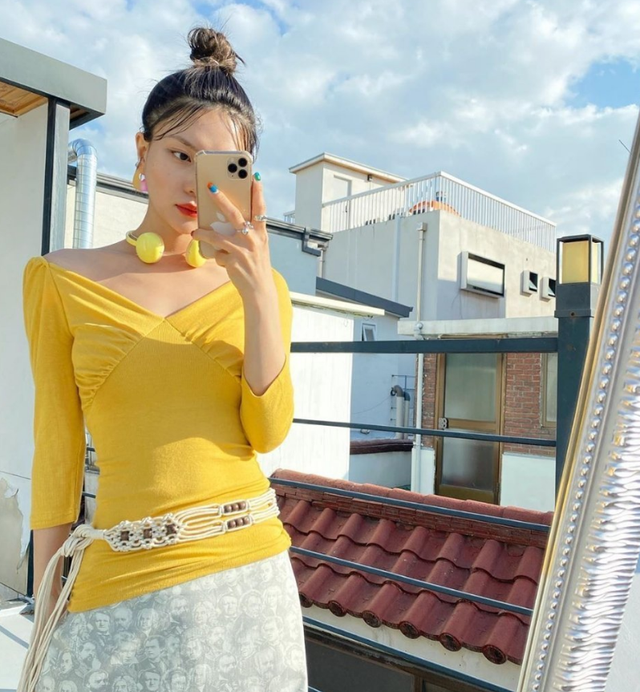 这身超级显气质的搭配,上衣是显白和抬气色的小鸡黄,上衣是民俗风的腰带,很有设计感,下半身搭配了头像印花半身裙短裙,很有设计感。