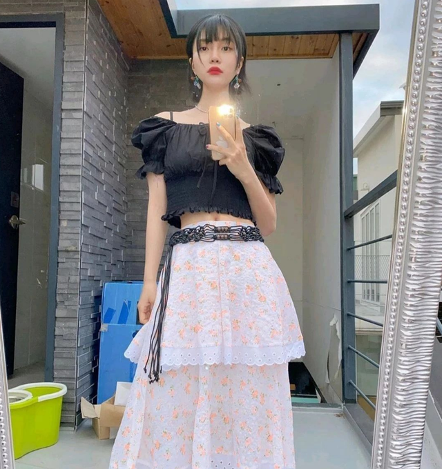 黑色的一字肩上衣选择蛋糕裙时,可以采用多层波浪形,轻松改变仙美的穿着方式。