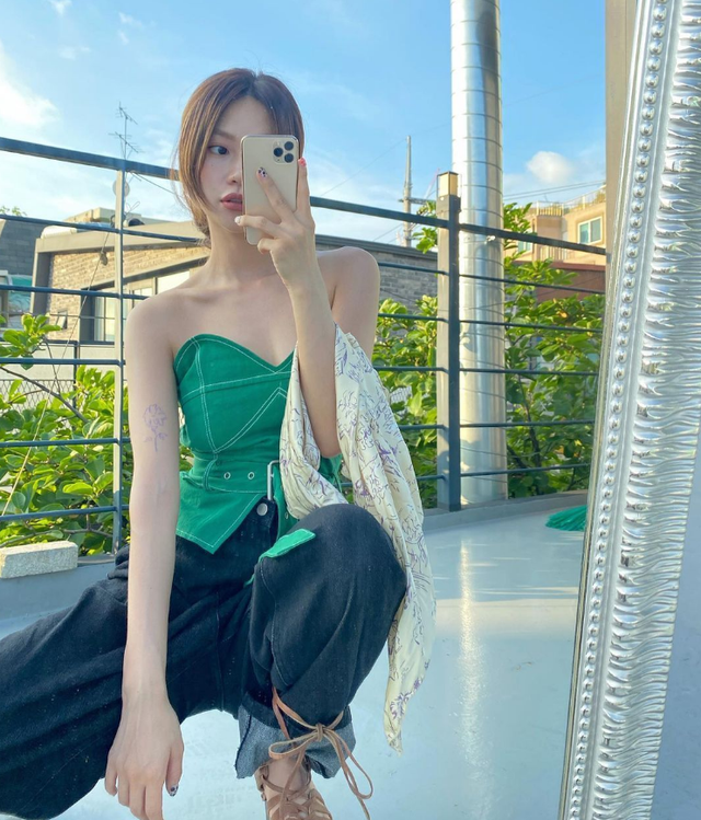 小姐姐一袭绿色抹胸小衫搭配牛仔裤,范十足。
