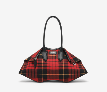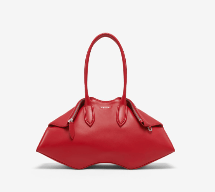 The Manta Bag —— 光滑黑色与亮红皮革呈现锋利轮廓,银色金属细节点缀其中;另有品牌标志性 MacQueen 格纹呢料款与铆钉饰黑皮革款可选。