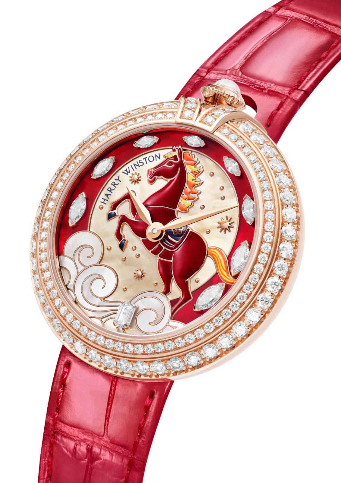 为庆祝中国马年,海瑞温斯顿 Moments系列推出一款奢华玫瑰金腕表。表盘上的骏马采用鲜艳的红色漆面,栩栩如生,彰显出中国十二生肖中第七位生肖所象征的独立、力量和冒险精神。作品还致敬了深远的中国文化传统,缀以海瑞温斯顿至美的璀璨钻石,尽显非凡魅力。这款马年主题腕表限量发行8枚,寓意吉祥美满。
