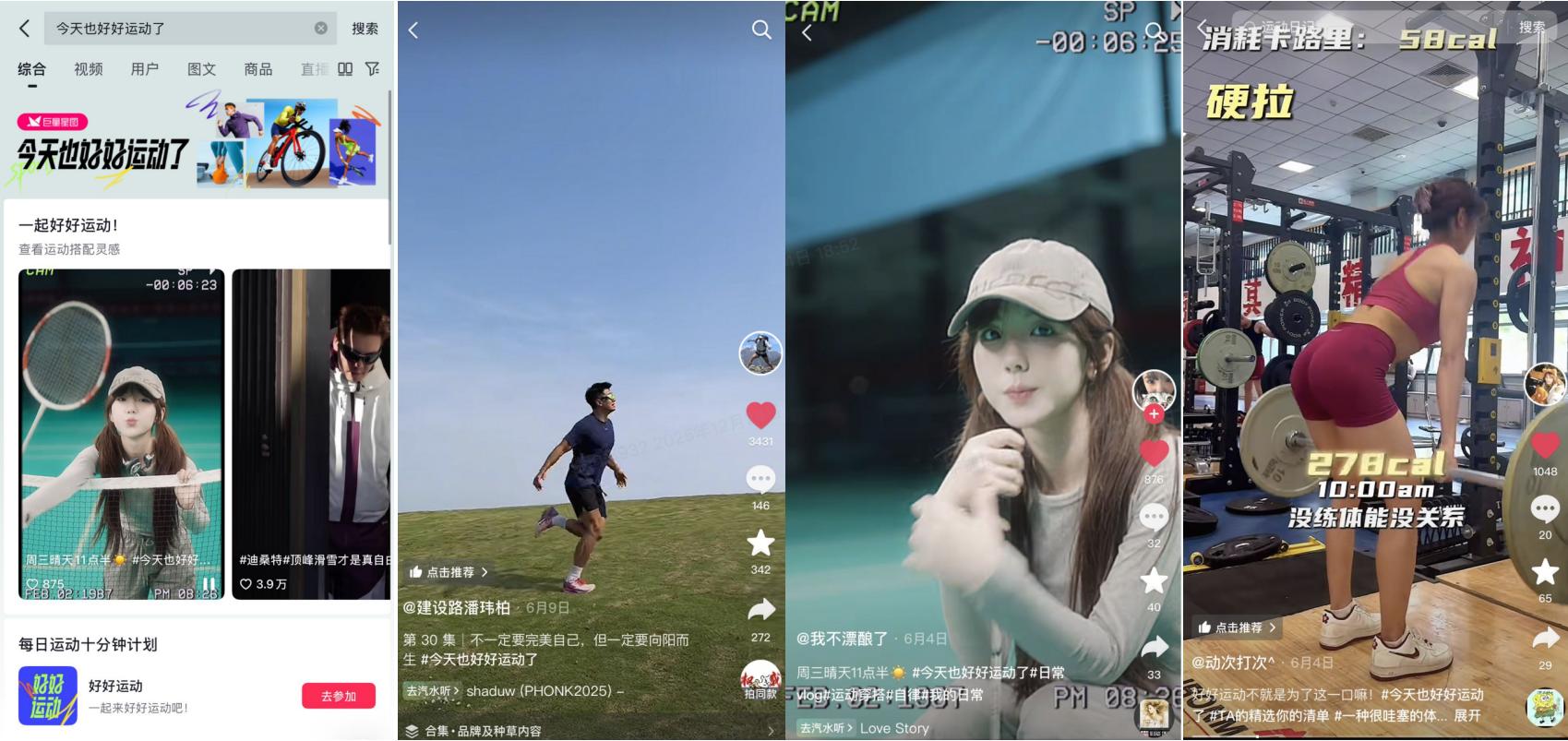 在线上,「今天也好好运动了」通过系统化的资源布局实现广泛触达和深度互动。本次IP专项在站内发起覆盖抖音生态的高曝光攻势,并携手运动领域的优质达人,以“高能量TA的一天”为主题进行集体官宣,以达人真实的生活切片和运动瞬间迅速在站内掀起趋势话题。同时,专属话题页#今天也好好运动了及配套的活动页H5、搜索彩蛋等产品阵地的建立,确保了传播能量的持续聚集与转化引导,更重要的是,IP成功卷动了从头部优质达人至广大运动爱好者的内容共创浪潮,通过发起「运动人的100种高能量方式」征集等形式,激发了海量UGC内容的生产,让“高能量生活方式”从IP主张演变为一场全民参与的价值表达运动。