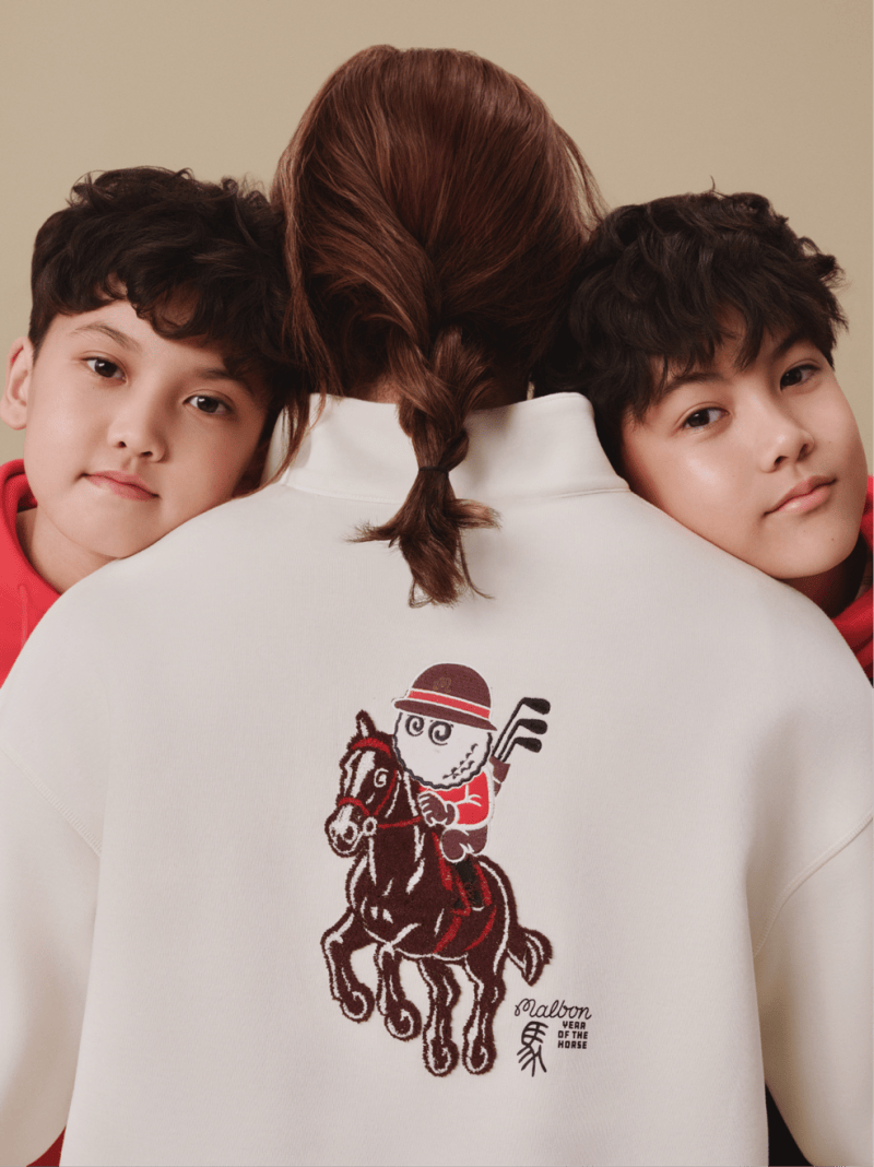 限定系列在设计细节上极具匠心:成人系列通过形似篆体“马”字的细节标识,演绎层次丰富的质感审美;而儿童系列则以充满好奇心的卡通画风,鼓励新一代勇敢探索未知。系列选用了代表节庆仪式感的中国红、深邃的藏青色以及优雅的象牙白作为核心色彩,并结合牙刷绣、光线包针绣等精致工艺,让高尔夫运动的质感在每一寸面料中自然流露 。