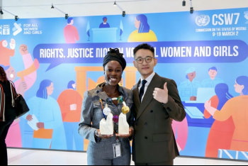 2026年3月,联合国纽约总部。第七十届联合国妇女地位委员会会议期间,“数字赋能女性公益成果展”在此隆重举行。植根于对中国深厚文化遗产的珍视品牌“隐山见物”,携手艺术家迟迟CHICHI呈现联名作品《山有宝物》等,同时东方玩偶作品《Ba Boom ! 怦怦》首次在国际舞台展出,此系列以全新的创作视角,将陶瓷与锡绣、点翠、绒花、红绣等多种非遗元素有机互融。