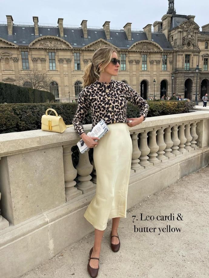 Jeanne Andreaa 的穿搭逻辑里,“平衡” 是核心关键词。第七套的豹纹针织开衫搭配奶油黄缎面半裙,经典豹纹以低调姿态融入造型,柔滑的缎面中和了毛衣的厚重,棕色玛丽珍鞋延续温柔基调,既保留了职场的专业感,又藏着法式独有的浪漫;第八套的紫色针织衫搭配白色半身裙,鲜亮的紫色作为视觉焦点,搭配同色系小方包,软糯的马海毛材质自带春日暖意,打破了基础色穿搭的单调,却依旧保持着法式穿搭的高级质感。