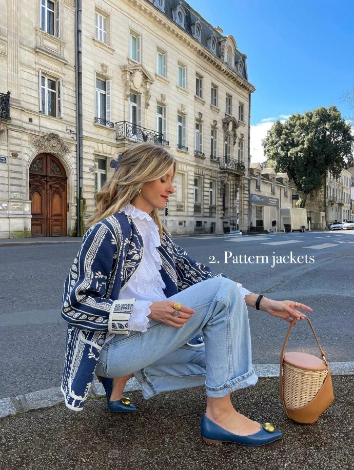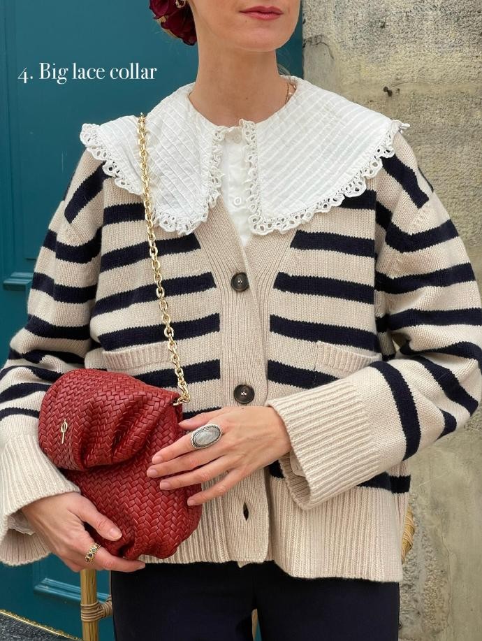 她深谙基础款的穿搭魔力,第二套的印花外套搭配白色蕾丝衬衫与卷边牛仔裤,蓝调印花呼应晴空,柔美的蕾丝领口中和了外套的利落感,脚下的蓝色平底鞋与藤编包相映成趣,把职场通勤的干练与春日的浪漫揉合得恰到好处;第四套的条纹针织衫搭配大蕾丝领内搭,酒红色编织包与红色发饰形成色彩呼应,软糯的针织质感消解了条纹的硬朗,慵懒又不失法式分寸感,是日常通勤可直接复刻的温柔范本。