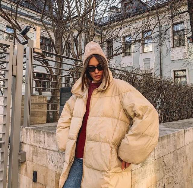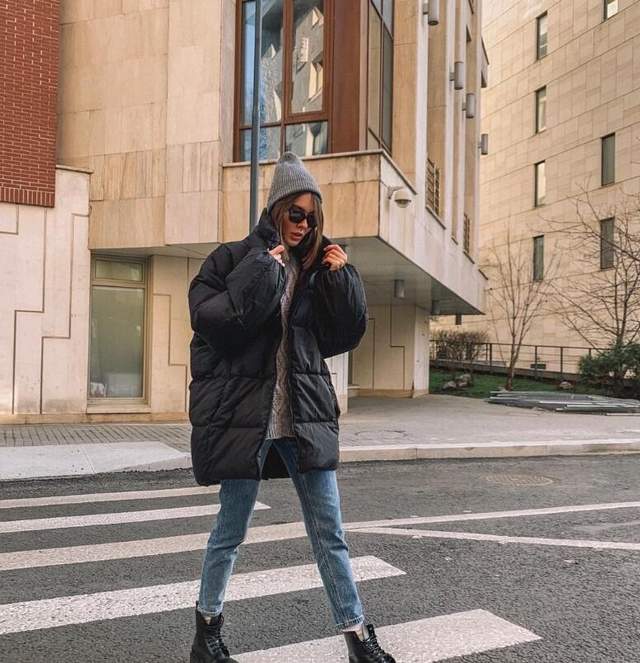 黑色面包服配针织帽保暖大气,减龄时髦,黑色是秋冬季节的经典颜色,会让人看上去有几分暗沉。把衣领立起来会产生非常明显的保暖效果,而且立领能够很好地修饰脸型,显脸小,让面部轮廓更加柔和。面包服的线条非常圆润,袖子长到可以盖过手背,非常温暖而且让整个人看上去更加小鸟依人。