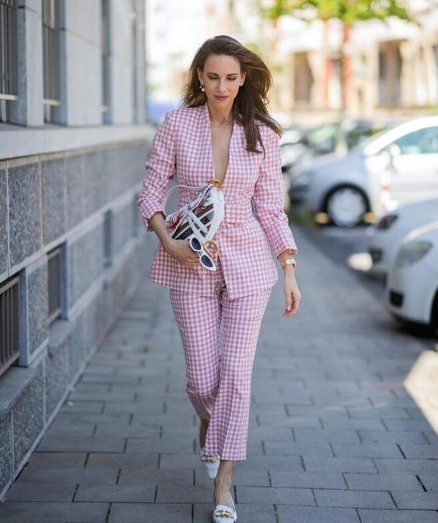 粉色格子的西装外套和喇叭九分裤,既保留了正式、干练的一面,同时又增添了更多甜美、优雅的女性气质。
