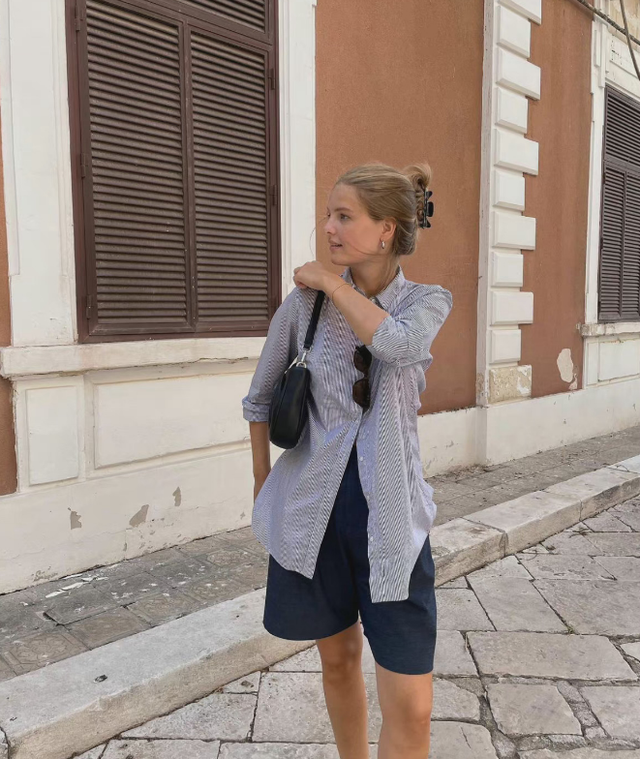 蓝色的竖条纹衬衫,在夏季里穿上就是自带小清新范,你觉得呢?又是比较简约的一款,深搭配灰蓝色休闲短裤,舒适又休闲!