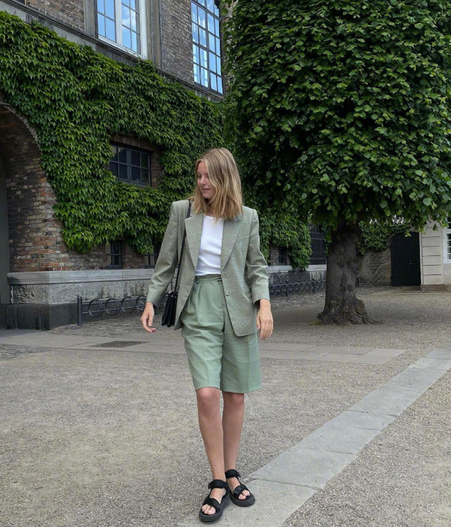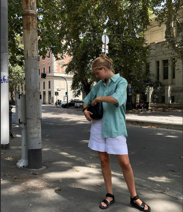 蓝绿色衬衫加白色短裤的搭配,可以说是欧美休闲风中的经典,虽然扣子全扣,但搭配撕边牛仔短裤,丝毫没有减弱活泼感。衬衫衣角塞一半,这种搭配方法其实也是为了打造不对称的美感,仅仅只是将一半的衬衫衣角塞进短裤的裤腰里面。但是达到的效果都是差不多的,将女孩的腰线显示出来,这样会显得身材比例更完美,更容易穿出好气质和时尚感。