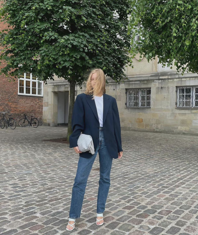 深蓝色西装套装里面融合了复古风的设计,深蓝+牛仔蓝,属于同色系搭配。深蓝稳重凝练,牛仔蓝休闲懒散,两者正好互相平衡。
