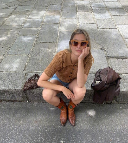 “大地色系”,棕色系服装搭配不宜显老气,搭配一条牛仔短裤,使用棕色尖头中筒靴作为简洁造型的亮点,非常有女人味。