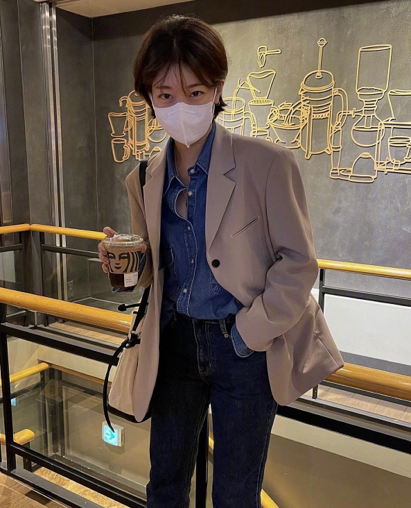 卡其色西装,选择了oversize风的款式,想要穿得时尚,我们还要考虑显高显瘦这一穿搭问题。