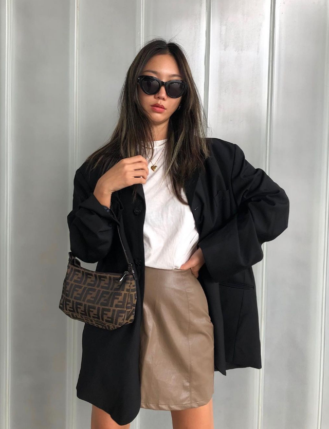 挑选了一件黑色西装,并且搭配卡其色皮革半身裙,看上去成熟且稳重,里面搭配了白色T恤也能够提升亮点,看上去更加具有层次。