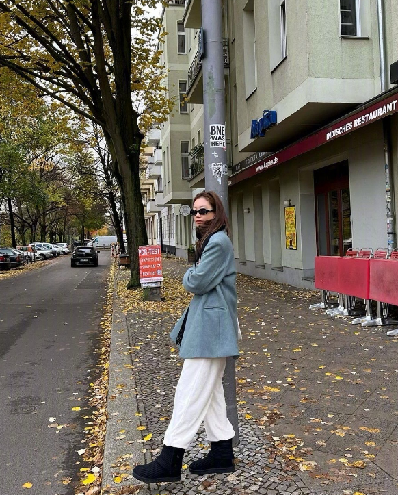 蓝色和白色的组合尤为清新大方,这种颜色虽然简单,却充分表现了清新脱俗的气质,蓝色西装配白色阔脚裤,再搭配一双雪地靴,慵懒又有范。