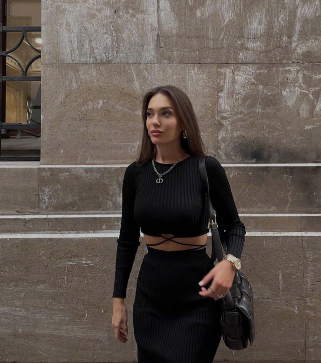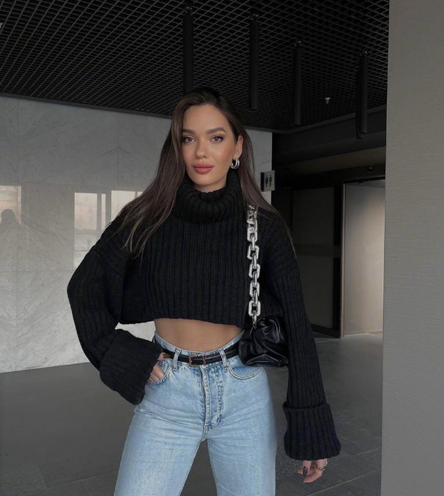 美女红唇艳丽,五官精致,是一等一的美人呢。露脐黑色针织背心,不管是搭配搭同色阔腿裤,还是牛仔裤,都是那么简约又时尚,简简单单衬托优雅的气场。