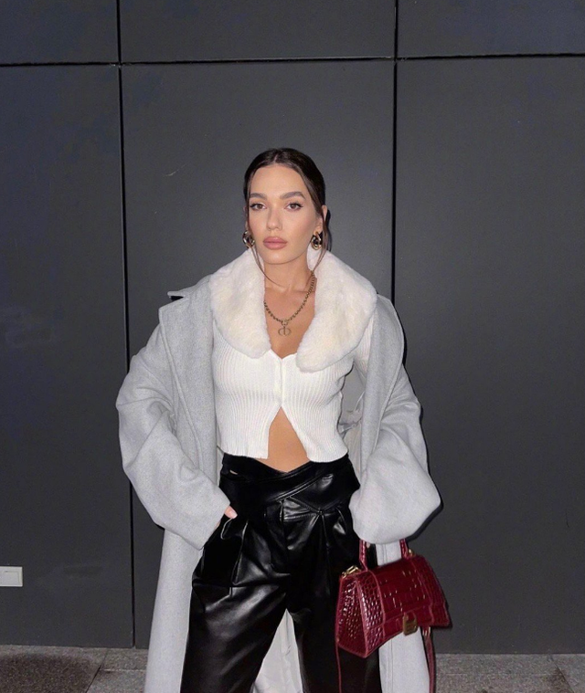 皮裤常常会以一体成型的剪裁方式呈现,所以很容易穿得无聊,何不用一些极简的装饰点缀其间,例如腰带、腰链的加入不仅可以提高腰线从而起到拉长双腿的效果,还可以增加穿搭精致度,别提多有范了!