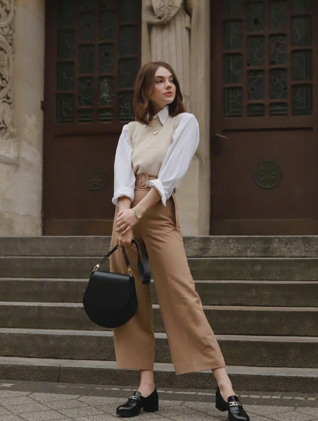 白色的衬衫,然后外面再搭配一个马甲类型的针织衫就可以了,然后裤子的话,搭配九分卡其色阔脚裤,感觉也是特别好,而且也很宽松,穿出来也比较舒适。