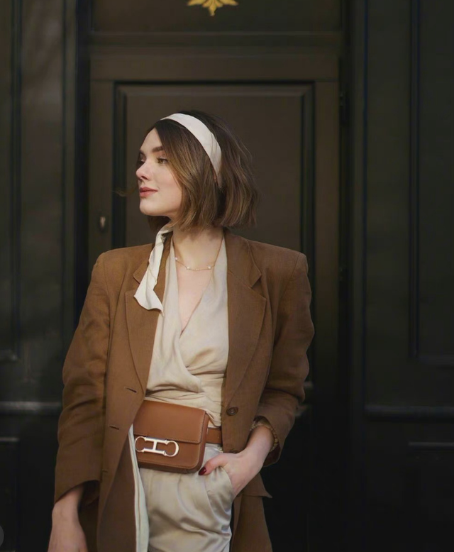 内搭白色+外搭卡其色的搭配,因为白色给人的感觉是特别干净的,比起卡其色更能起到提气色的作用。在这两者的衬托下,原本不起眼的卡其色,反而一下子变得高级许多