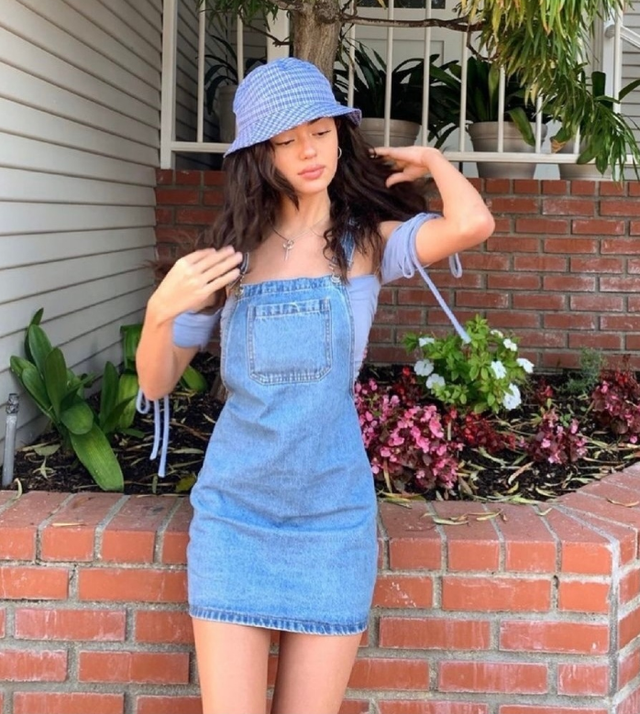 一字肩上衣把自己美美的锁骨和天鹅颈展示出来,优雅的肩颈线会让人羡慕不已!搭配一条减龄的背带牛仔裙,清新而且甜美女人味十足。