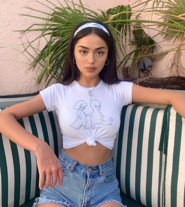白t恤的一边打了个结,这样就紧紧地勒住了她的腰部,同时让款式稍微变得露脐了,其实这种效果在搭配牛仔短裤时还是很和谐的,看起来也让她整个人都很有活力,同时又不缺少时尚气息。