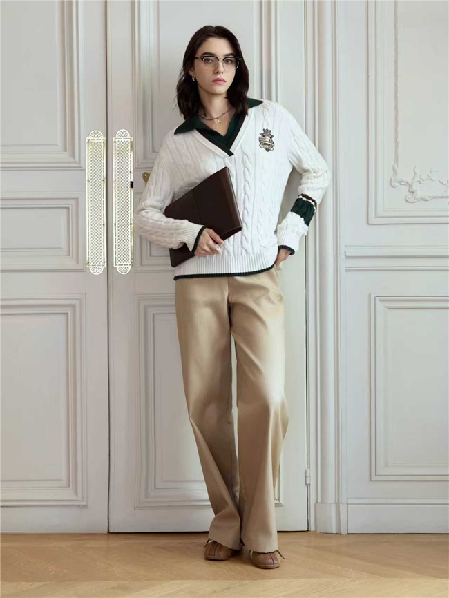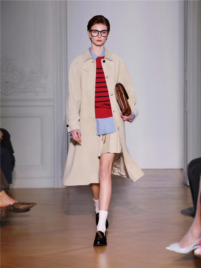 充满“冲突感”的混搭手法贯穿本次发布秀,为经典单品注入全新的时尚叙事。标志性的格纹大衣与西装、充满摩登感的皮革外套、知识分子撞色毛衫和自由休闲日装组合,通过强烈对比的层次叠穿,混合不同风格语言,既矛盾又和谐,让传统精英气质与现代独立精神兼容并存,展现女性多面的魅力。