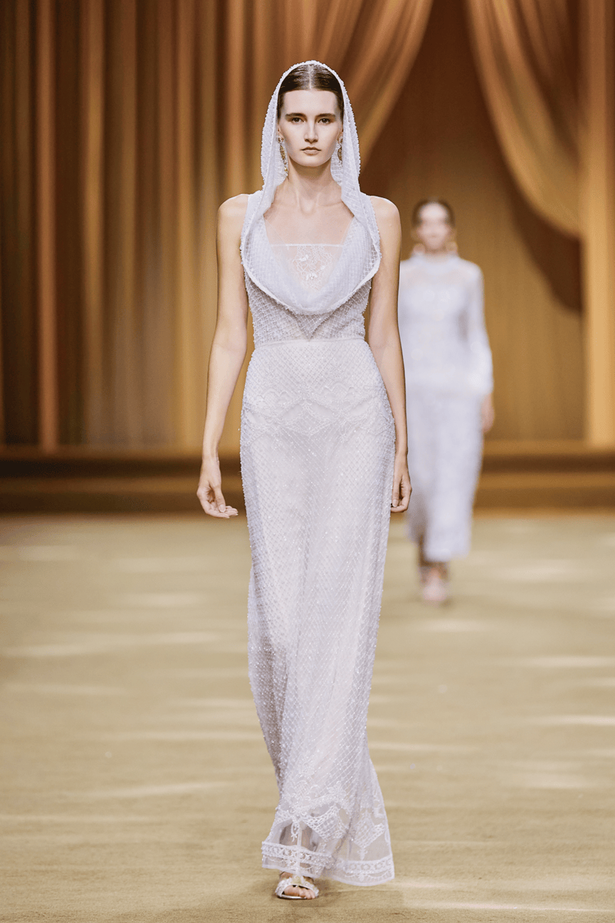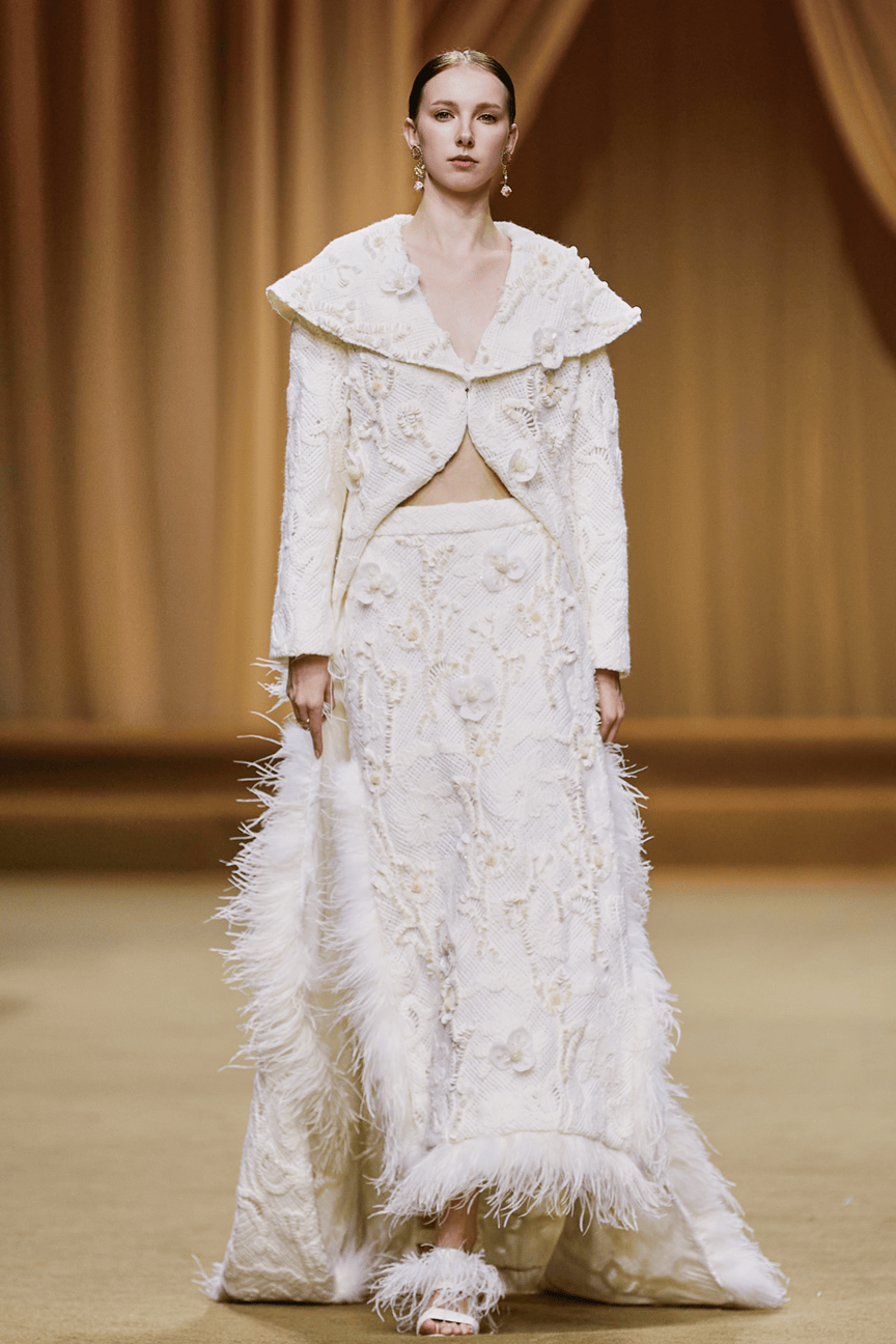 Marie Elie本季大秀的灵感,源自于对古希腊神殿建筑与神话传说的崇高敬意与浪漫解读。品牌创意总监从帕特农神庙的庄严柱式、女神雕塑的飘逸线条,以及神话故事中的瑰丽想象中汲取养分,将古典美学的精髓——和谐、比例与秩序,与Marie Elie标志性的精致、优雅与梦幻的风格相融合。系列旨在探讨永恒经典与当代精神的对话,赋予古老文明以崭新的时尚生命力。