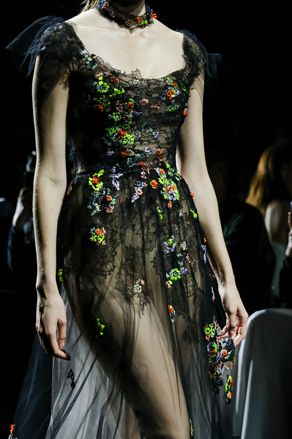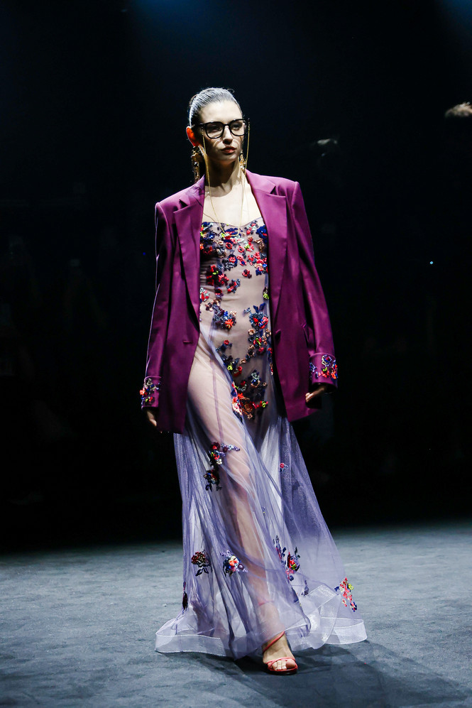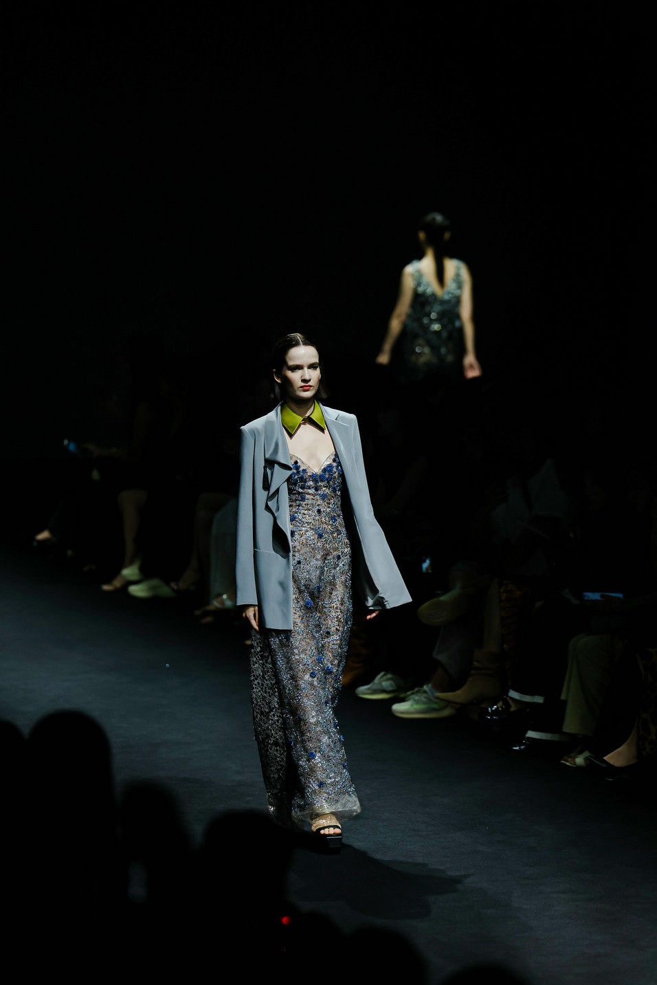 本季引人注目的是对非遗湘绣的创新运用,湘绣鸢尾以“乱针绣”呈现写意形态,丝线光泽随光流转。设计师将东方意境融入当代剪裁,同时汲取18世纪硬朗而优雅的轮廓,以简洁廓形、流畅线条碰撞出身心的随性。
