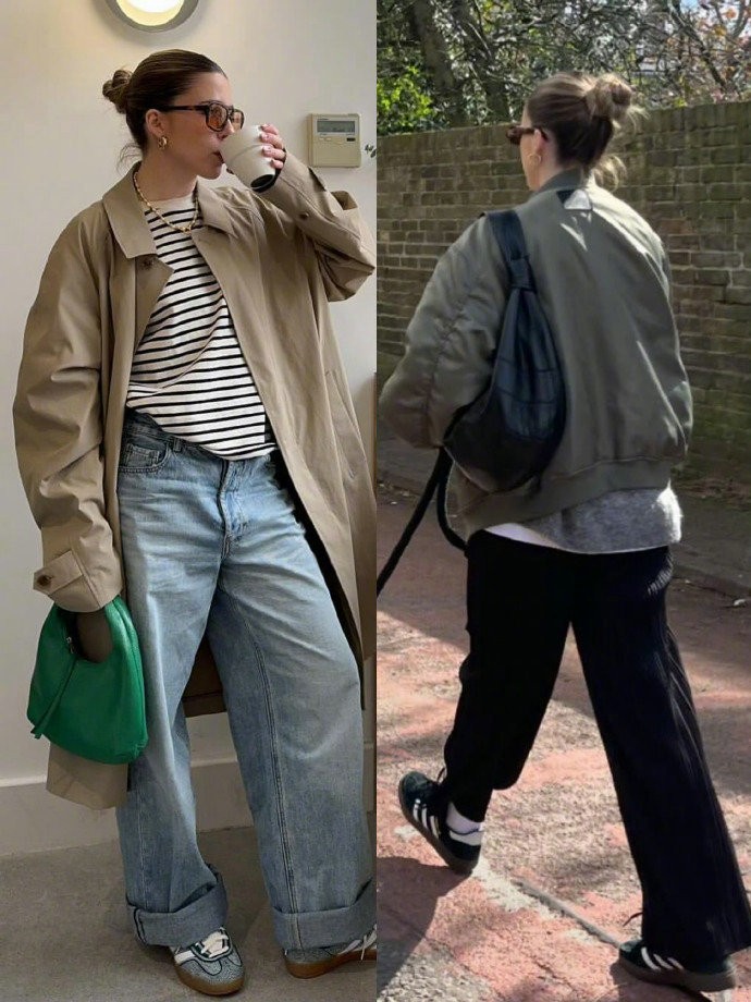 最让人觉得实用的是,Charlotte Olivia 的穿搭完全贴合英国日常的多样场景,从通勤到休闲,从室内到户外,每一套都有清晰的适配性。工作日去公司,她常穿 “燕麦色西装外套 + 白色内搭 + 卡其色烟管裤 + 裸色高跟鞋”,西装选宽松却不垮塌的版型,裤子长度刚好露出脚踝,整体利落又不失温柔,既能应对会议场合,又不会显得过于严肃;周末去逛市集,她会换成 “条纹长袖 T 恤 + 浅灰色休闲裤 + 白色运动鞋 + 帆布托特包”,T 恤塞进一半下摆,显得随性又不拖沓,大容量托特包刚好装下钱包、钥匙和买来的小物件;如果遇到英国常见的阴雨天气,她会在基础穿搭外叠一件长款风衣,选防水面料的款式,搭配一双短靴,既能遮风挡雨,又能靠风衣的垂坠感提升整体气场。这种 “场景化穿搭” 没有复杂的技巧,却能让普通人每天早上不用纠结 “今天穿什么”,只需根据当天行程,套用她的搭配逻辑就能快速出门。