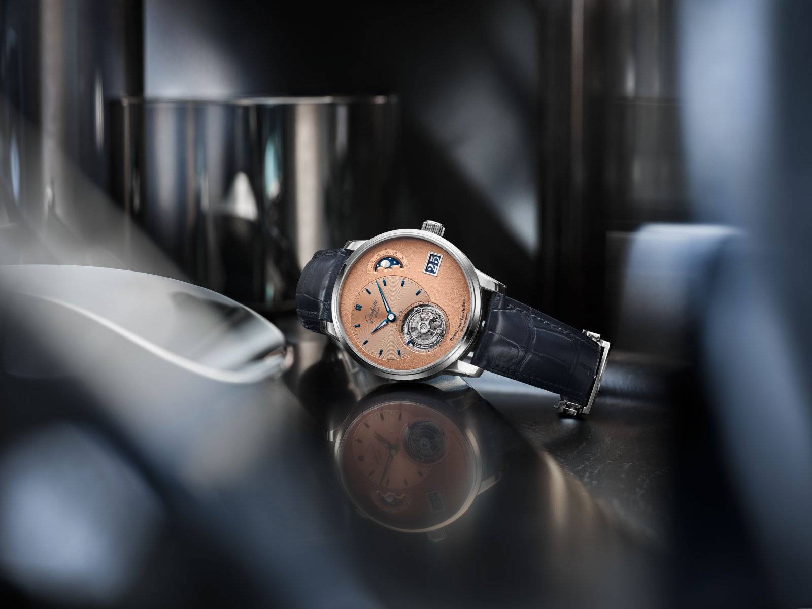 这枚偏心月相陀飞轮腕表凝聚了格拉苏蒂180年制表艺术的精髓,每一处细节都诉说着品牌非凡的制表传承。作为格拉苏蒂地区唯一拥有独立表盘工坊的制表品牌,格拉苏蒂原创将世代相传的工艺智慧融于这枚时计之中。表盘独特的铁矿石色泽经过复杂精密电镀工序锻造,其独特的晶体结构让色彩随着光线流转而变幻,宛若晨曦中的矿石般熠熠生辉。左侧的偏心时分显示区饰以精密的唱片纹雕饰,在整体布局中形成绝妙的视觉焦点,尽显德系制表的严谨美学。