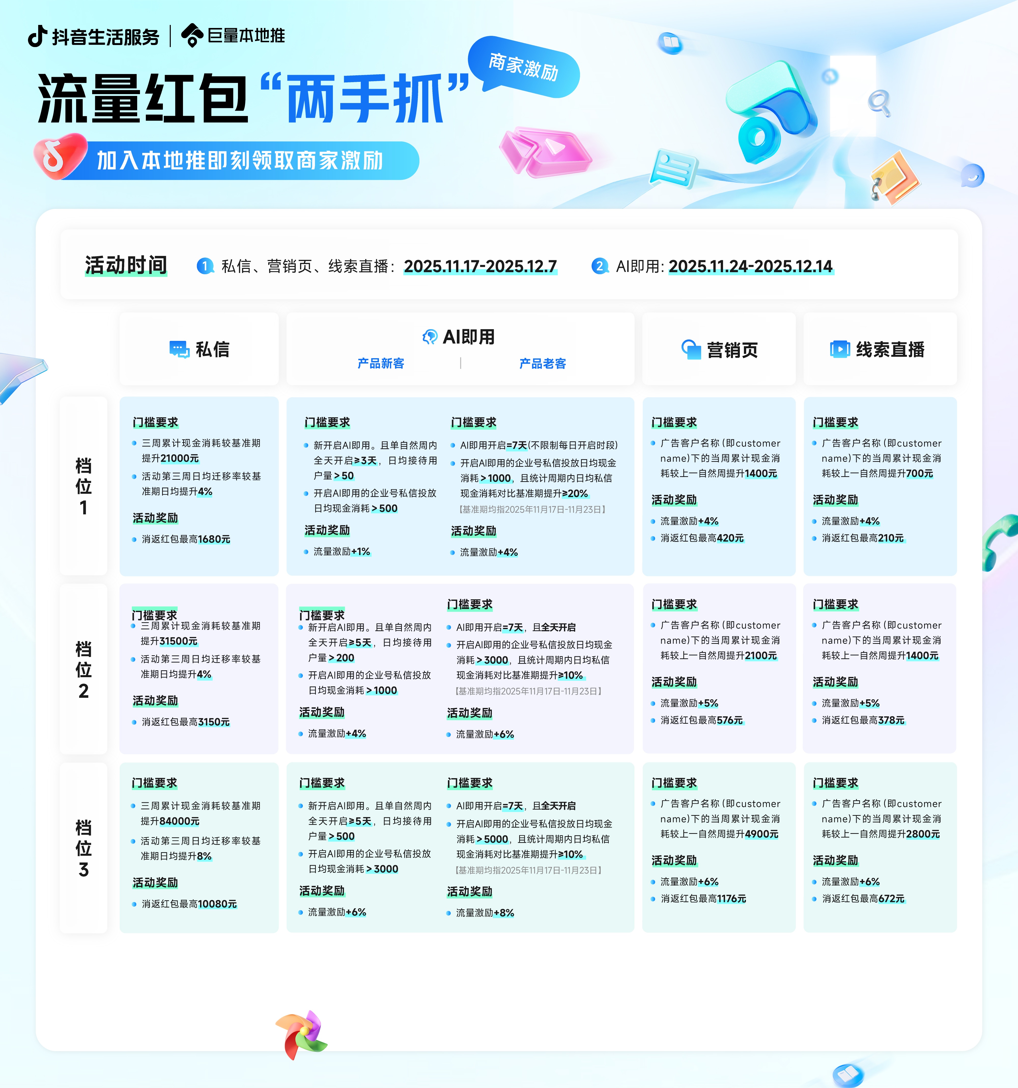 2025 年,线索生意的新机遇已经到来,巨量本地推正以更完善的功能、更丰厚的福利、更严谨的产品逻辑,陪伴本地商家告别增长困境,在精细化运营的浪潮中,稳稳抓住每一份确定性的增量,从而实现生意的可持续增长与盈利升级。