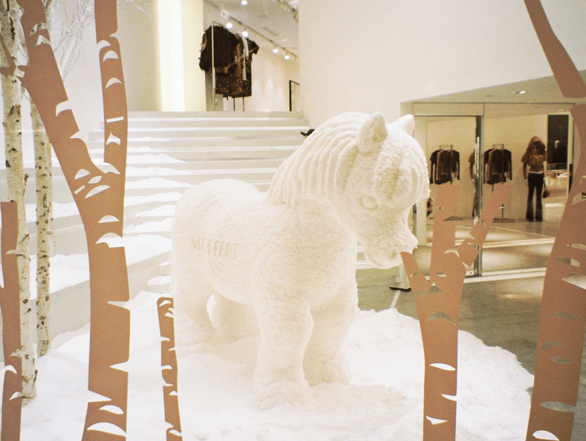 橱窗设计延续这一叙事线索,将雪地的肌理与马蹄铁的符号并置呈现。产品仿佛嵌入冰雪之中,既是被展示的物件,也是场景的一部分。柔软与坚硬在同一画面中共存,形成一种低声却持续的张力。