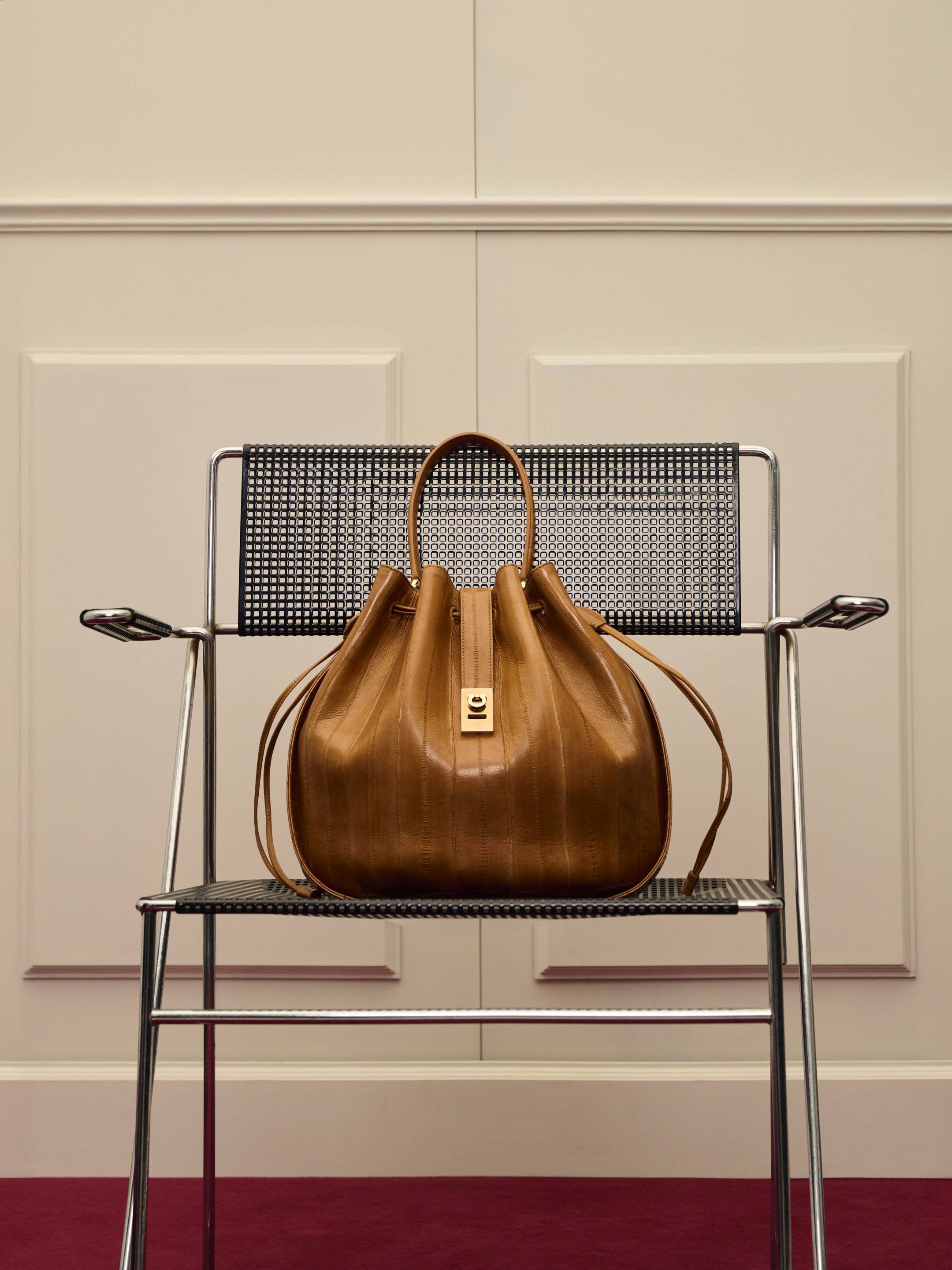 甄选系列亦包含一款自然原色皮革水桶包,配以经典Hug扣饰。