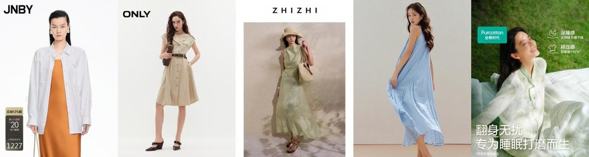 在本次大秀中,“素然”篇章多款天然棉麻服饰集中亮相,聚焦舒适性与自然质感。JNBY宽松衬衫以H型剪裁搭配落肩设计,打造春日松弛感;ONLY牛仔连衣裙柔软亲肤,A字剪裁清爽利落;致知苎麻套装的抽绳收腰与宽松裙摆设计,营造文艺休闲氛围;茵曼法式V领吊带连衣裙打造春日轻盈浪漫造型;全棉时代空气褶皱纱睡衣蓬松透气,宽松短款设计无束缚感。