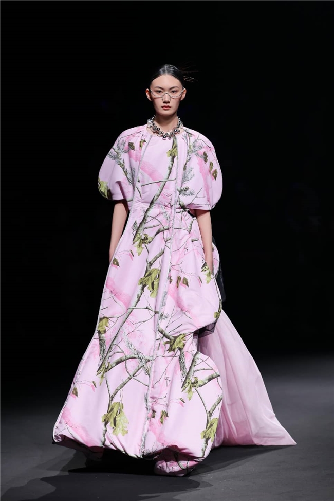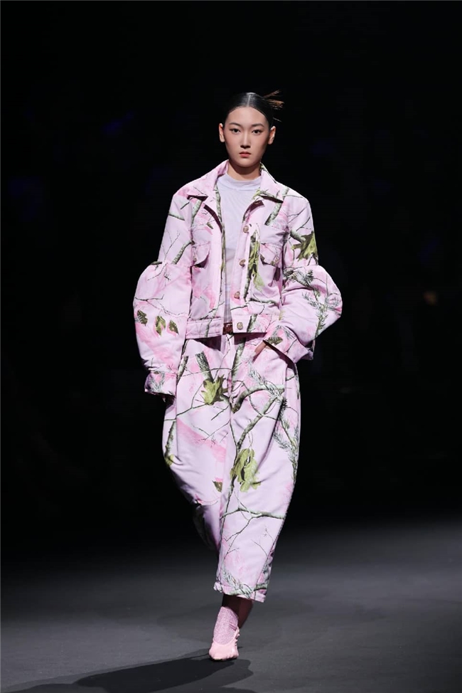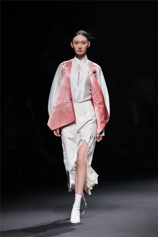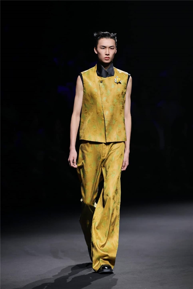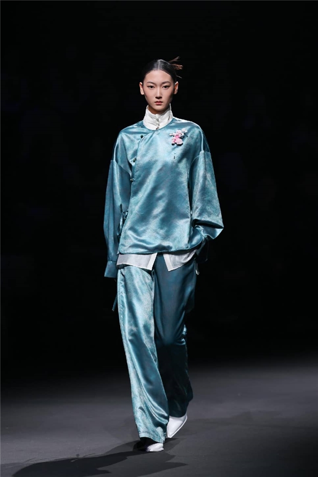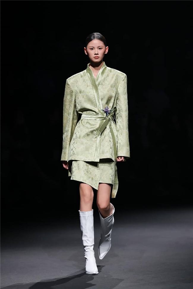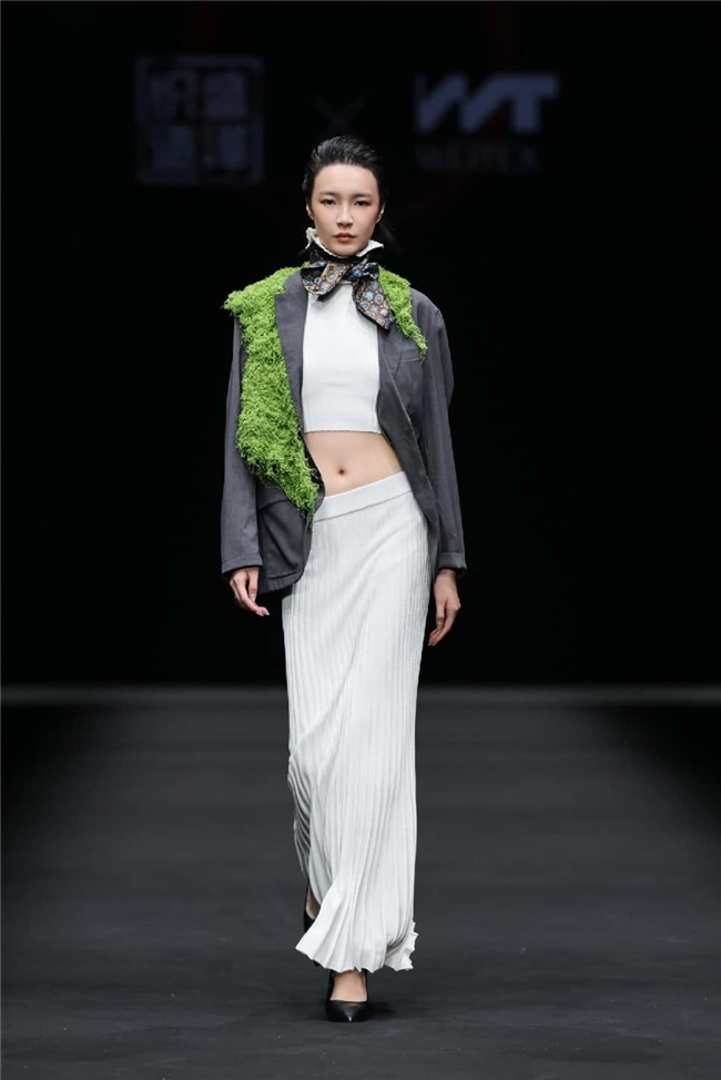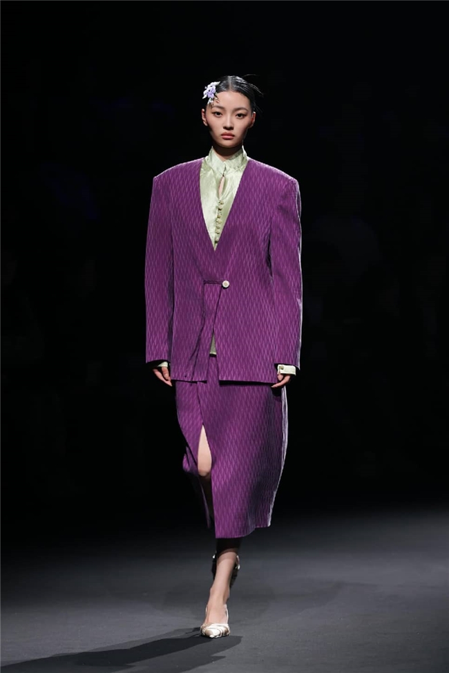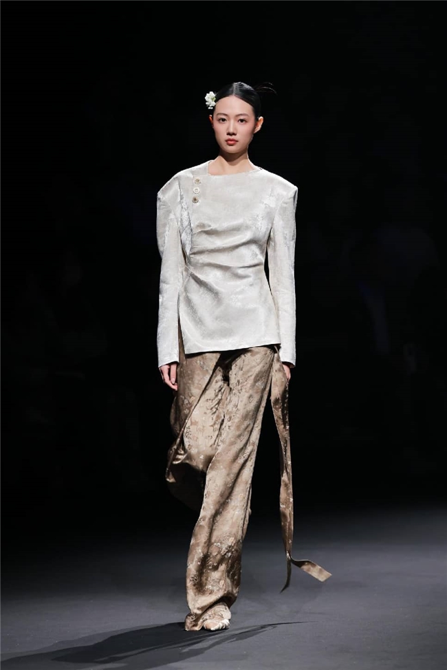 恒信织造通过“流淌”主题,打造出一场兼具东方传统美学与自然休憩感的潮流梦境。包括醋酸在内的一众优质纤维素面料,通过柔润飘逸的质感和充满雅韵的光感,成为温柔与诗意的绝佳载体。部分织物以丝滑触感搭配优雅自然的肌理,显露灵动的韵味,同时利用独特的提花织造工艺,将流水、竹影等意象织就成细腻暗纹,在经纬交错间勾勒流动光影,为服装的叠搭强化梦幻的意趣。一系列表面带有哑光、微皱外观的面料兼具生态可持续属性,搭配生物印染工艺呈现的优雅治愈色彩。为烘托面料的质感,衣角处立体装饰的非遗绒花引发关注,于感性浪漫的氛围中,映衬出静雅的传承之美。
