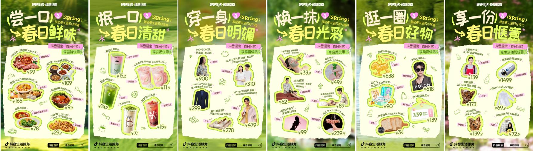 循着代言人的春日足迹,抖音生活服务将这份春日灵感落地为六大场景清单,搭配平台专属团购优惠,让每一份对美好的向往都能轻松实现,不用费心比价,一键畅享春日小确幸。