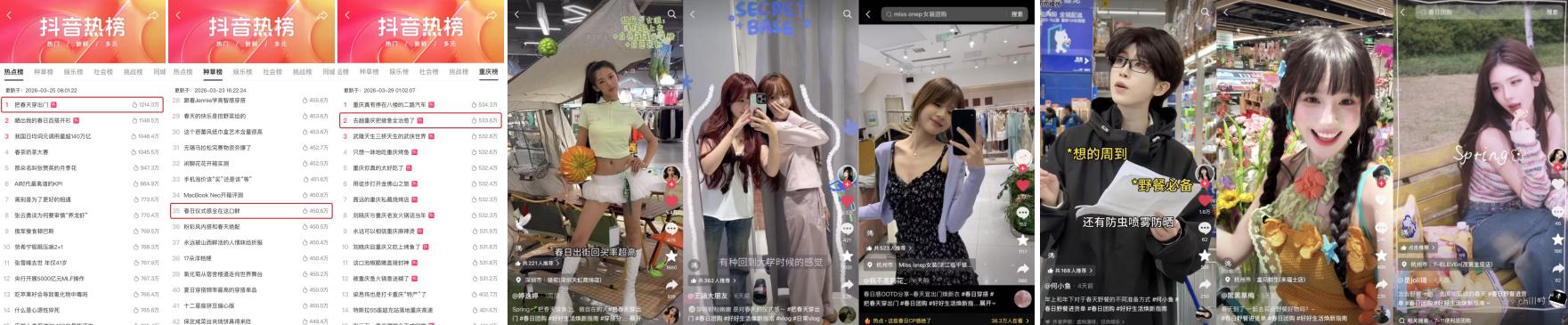 站内多品类热点话题登榜,精准触达春日消费人群,春日消费相关话题总曝光超3亿。本次活动相关话题#把春天穿出门 、#春日仪式感全在这口鲜 等成功破圈,吸引数千人参与分享春日消费体验。#把春天穿出门 登顶抖音总榜TOP1,话题热度超1200万;#春日仪式感全在这口鲜 种草榜TOP35;#去趟重庆把疲惫全治愈了 登上种草榜TOP5、重庆同城热榜TOP2;#春日野餐进货清单 覆盖浙江省9城同城热榜。真实体验内容激发用户共鸣和向往,让优质商家与商品获得广泛曝光与自然种草。