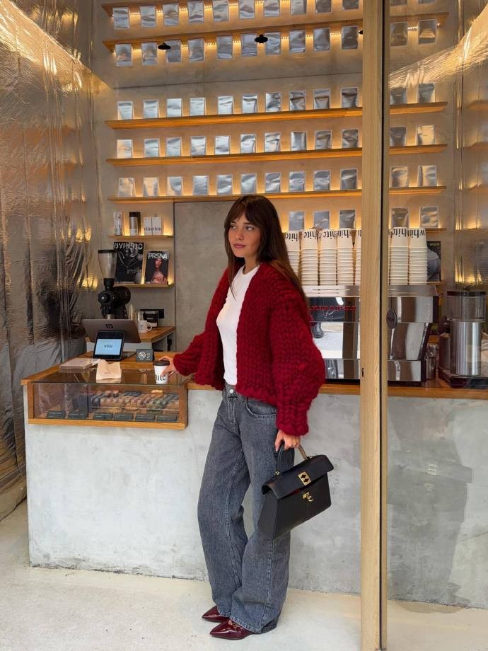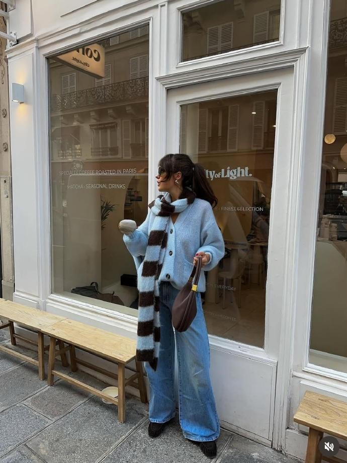 在 marie.helenedbs 的 16 套搭配中,色彩的运用堪称教科书级别,她擅长用色彩碰撞打破沉闷,也能靠同色系搭配营造高级质感。酒红色针织开衫内搭简约白 T,搭配深灰阔腿牛仔裤,再踩一双酒红色皮鞋,红灰撞色既显气色又不失沉稳;樱花粉皮质外套搭配酒红色灯芯绒长裤,温柔与复古的色调碰撞,让秋冬造型瞬间摆脱单调。而浅蓝针织衫与浅蓝牛仔裤的同色系搭配,搭配棕黑条纹围巾作为点缀,既保持了视觉的统一性,又通过配饰增添了层次感,每一种色彩组合都精准踩中时尚与日常的平衡点。