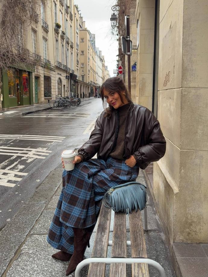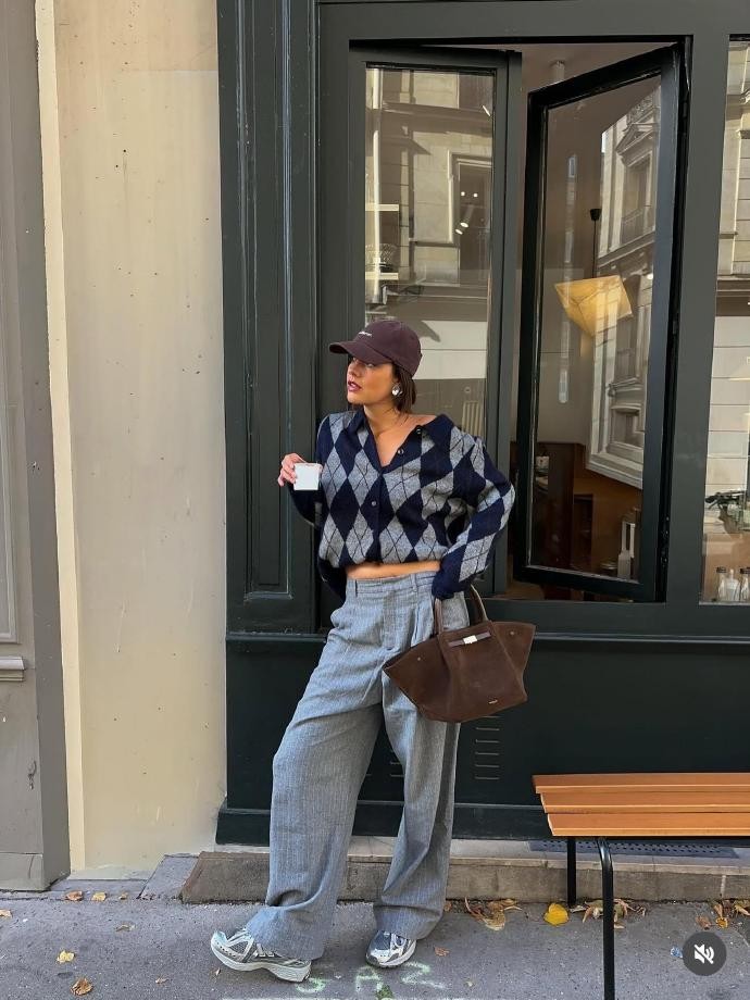 材质的混搭与基础款的巧用,是 marie.helenedbs 穿搭的另一大亮点,这也让她的 16 套搭配极具借鉴意义。她从不依赖昂贵的单品,反而将基础款玩出了新花样,棕色皮衣搭配蓝黑格纹长裙,皮革的硬朗与格纹的复古相互中和,再配上流苏小包,细节处尽显巧思;菱格纹针织衫搭配浅灰西装裤,休闲与通勤风格无缝衔接,踩一双运动鞋,轻松适配日常出行与轻办公场景。灰色西装外套搭配蓝色阔腿牛仔裤,脚踩经典雪地靴,将正装的利落与休闲装的舒适完美融合,让我们看到,基础款只要选对版型、做好搭配,就能穿出不一般的时尚感。