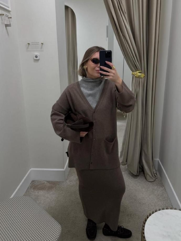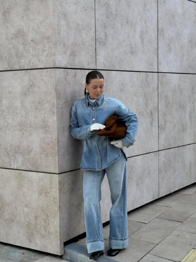 她的衣橱里满是带着时光温度的复古单品,牛仔套装、针织开衫、黑色风衣这些经典款式,被她重新组合,碰撞出不一样的火花。浅蓝牛仔套装搭配白手套与麂皮包,休闲中带着精致;同色系针织开衫与长裙叠穿高领打底,慵懒又温柔;黑色风衣内搭灰色背心与波点半裙,干练中藏着浪漫。这些看似简单的组合,在她的搭配下,既保留了日常的舒适感,又充满了复古艺术感,完美诠释了 “less is more” 的时尚哲学。