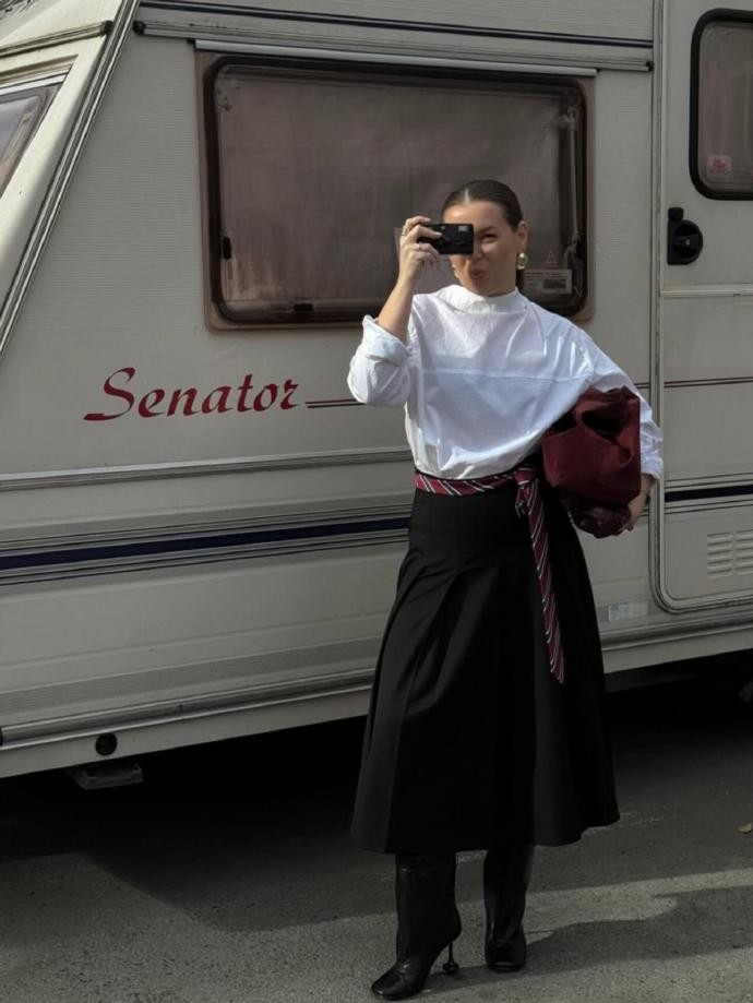 julychinilova 的穿搭核心,是对经典元素的极致运用与创新叠穿。她偏爱用条纹领带作为造型亮点,无论是搭配灰色大衣与酒红针织衫,还是叠穿在白衬衫与黑西装外,领带都成为打破沉闷的关键,瞬间赋予穿搭学院感与复古感。同时,她也擅长用波点元素增添灵动,白色波点半裙搭配红色针织开衫,或是作为黑色长裙的内衬点缀,让温柔与俏皮在碰撞中形成独特风格,让基础款瞬间拥有记忆点。