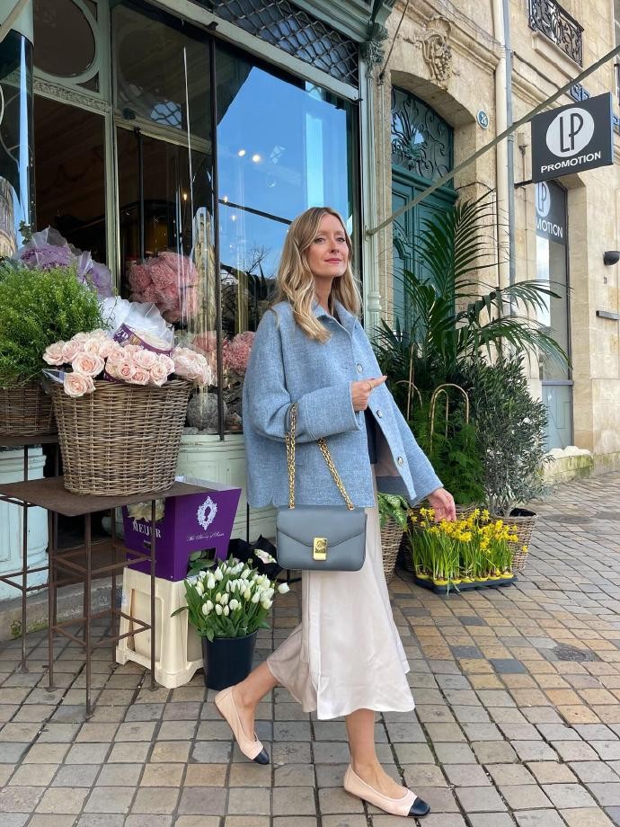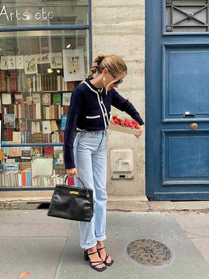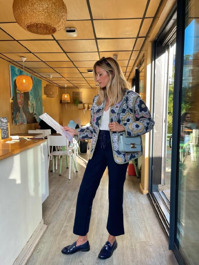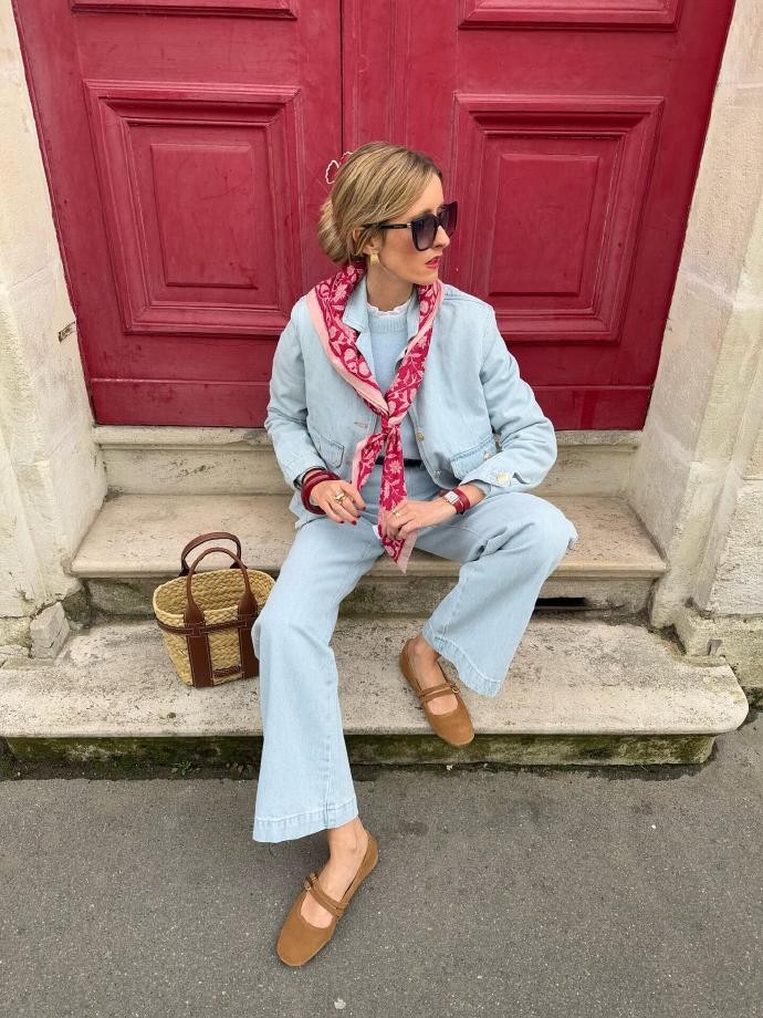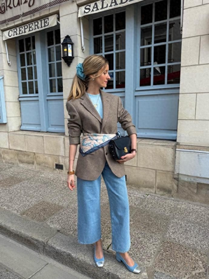 她的法式穿搭,是色彩的温柔碰撞,也是复古与现代的完美平衡。在她的造型里,你能看到浅棕色廓形西装搭配浅蓝色内搭与牛仔阔腿裤,用蓝色玛丽珍鞋呼应内搭色调,再以丝巾、发圈点缀细节,打造出温柔又随性的日常感;也能看到藏青色针织开衫搭配牛仔裤,用黑色凉鞋增添慵懒,或是浅蓝色绗缝外套搭配娃娃裙,用木质厚底鞋解锁复古俏皮,每一套都跳脱了法式穿搭的固有框架,却又精准拿捏了法式浪漫的核心。她从不局限于单一风格,而是将复古、休闲、精致揉进日常,用色彩串联起不同氛围,让法式时髦变得更加多元且接地气。