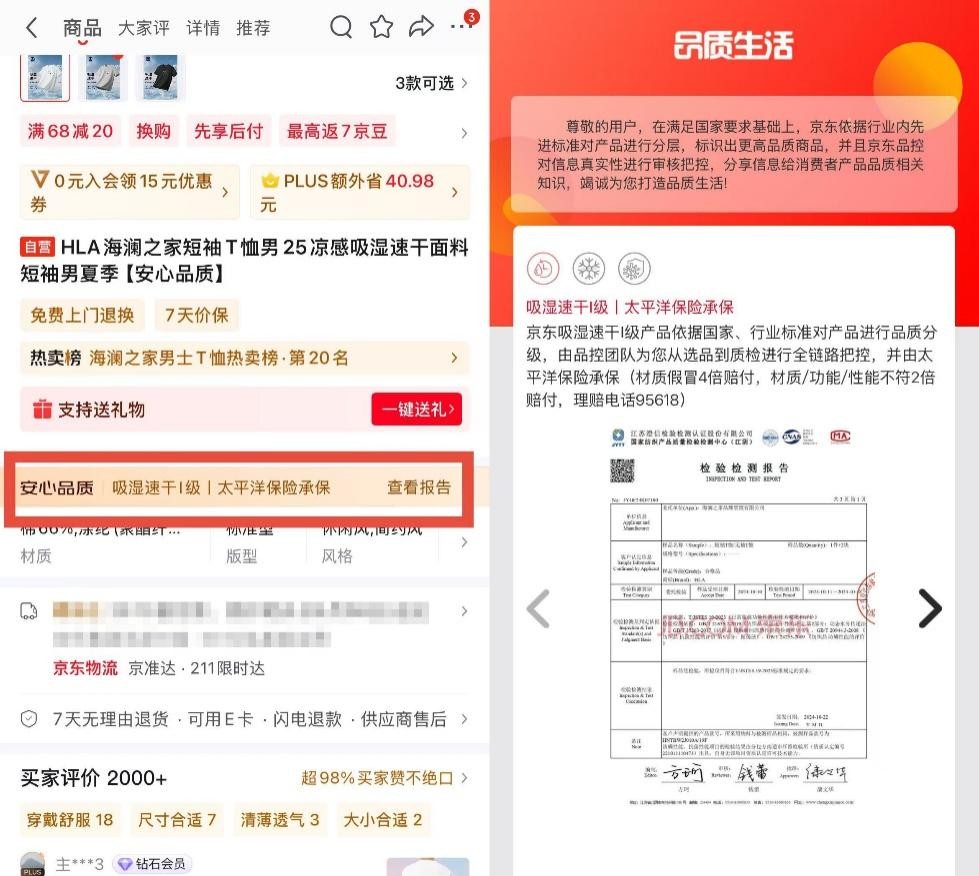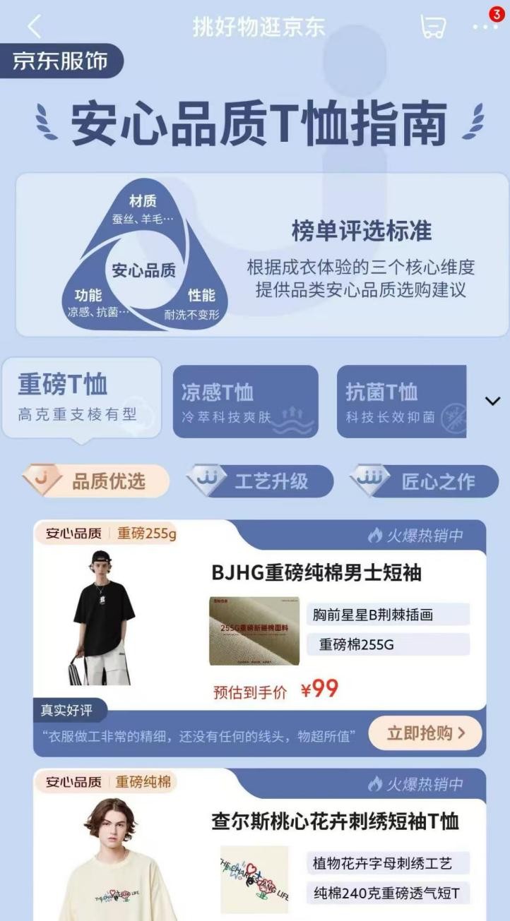 在社交平台上,类似这样的吐槽屡见不鲜。如今,消费者对服装品质和个性化需求日益提升,如何选购到品质与价格兼具的服饰,成为大家关注的焦点。5月8日,京东服饰携手中联品检集团,共同发布包括T恤、休闲裤、防晒衣、牛仔裤、内裤、休闲鞋等服饰品类在内的六大安心品质标准(以下简称“标准”),根据材质、性能、功能等多个服饰核心维度进行全面规范,对产品进行品质分级,从选品到质检全链路把控,为消费者提供更安心的服饰品类选购建议。同时,京东服饰还对符合标准的服饰产品进行统一认证标识打标,消费者认准“安心品质”标识即可放心选购,并承诺,每一件打标“安心品质”的服饰产品,若材质假冒,将予以4倍赔付。