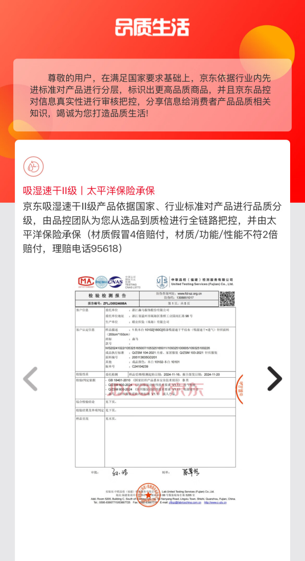 为让更多消费者拥有更优质、更具确定性的购物体验,京东服饰携手中联品检集团发布的六大安心品质标准,在材质、功能等服饰品类等核心维度基础上,也结合了目前市面上更受关注、更流行的各品类卖点,分别制定更详细的标准规范。此外,每一件打标商品,都拥有对应的国家权威机构质检报告,消费者在打标商品详情页即可进行查看。