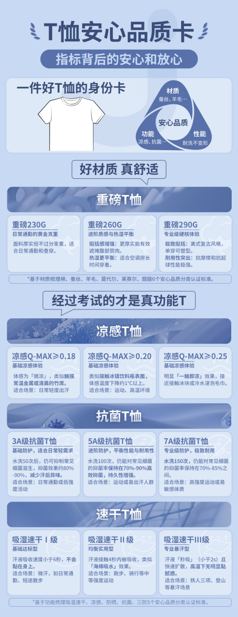 在T恤品类标准中,重磅纯棉标准按克重分级以对应不同的穿着体验,230g面料为日常通勤黄金克重,适合叠穿;260g增强挺括感,有效遮掩赘肉,更适合空调房穿着;290g更易塑型,抗摩擦抗起球,适合美式风格与户外场景。凉感以Q-max值分级,≥0.18适合日常轻度出汗,≥0.20适合运动等环境,≥0.25适合极端高温场景,且均高于国标Q-max≥0.15的要求。抗菌标准分为3A、5A、7A三个等级,最高实现95%-99%的抑菌率,且水洗150次仍有抑菌效果。吸湿速干分别为Ⅰ、Ⅱ、Ⅲ级,以评定面料吸收人体汗液、水分迅速扩散蒸发,确保肌肤干爽的时间。