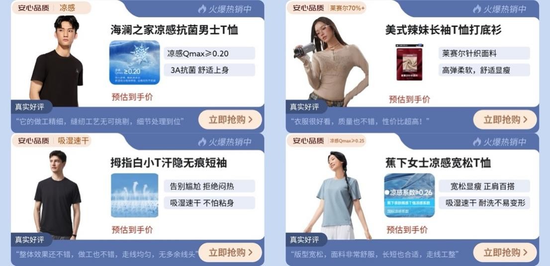 裤类中,森马夏季阔腿凉感牛仔裤,以棉天丝面料打造垂顺凉爽;Teenie Weenie小熊牛仔裤,甄选莱赛尔棉混纺面料,立体裁剪打造修长腿型;ELAND休闲裤,采用莱赛尔+亚麻搭配,实现轻薄触感与吸湿透气。逸阳镰刀裤,借助莱赛尔、亚麻与棉混纺,实现贴肤柔软,自带天然凉感不闷汗。